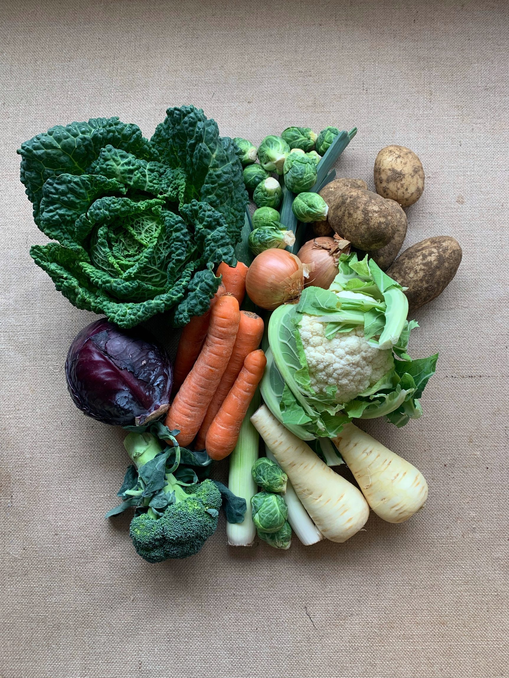 A smaller selection of essential Christmas vegetables. This box includes: Potatoes 1.5kg, Carrots 1kg, cauliflower 1, savoy 1, parsnips 500g, 1 broccoli, leeks 1kg, loose sprouts 500g, 3 onions
